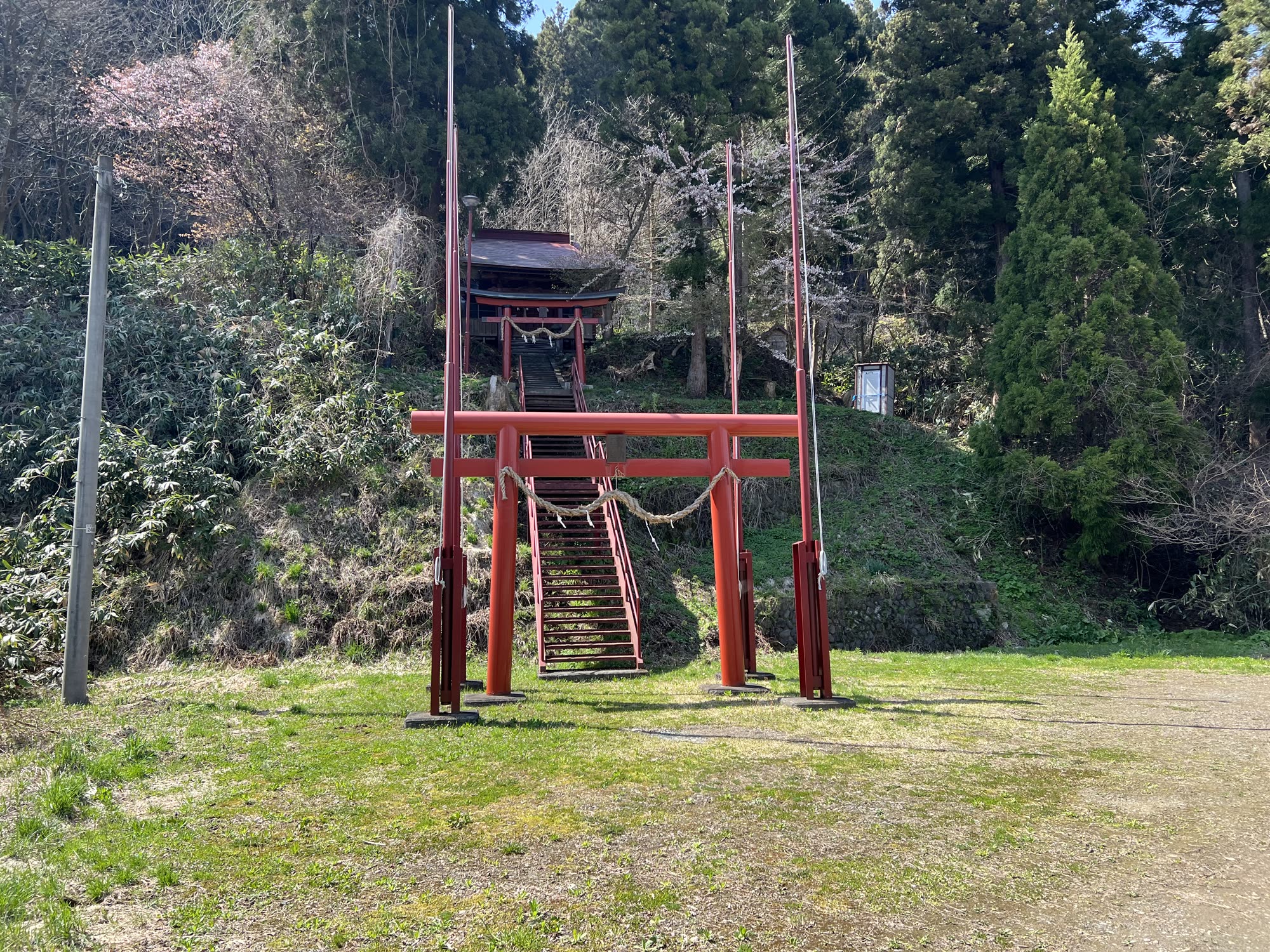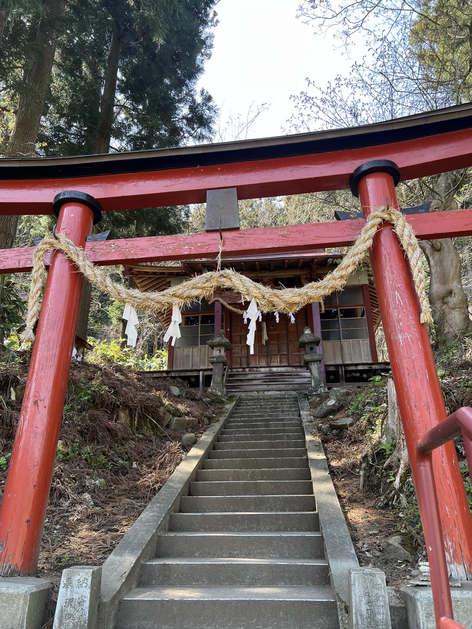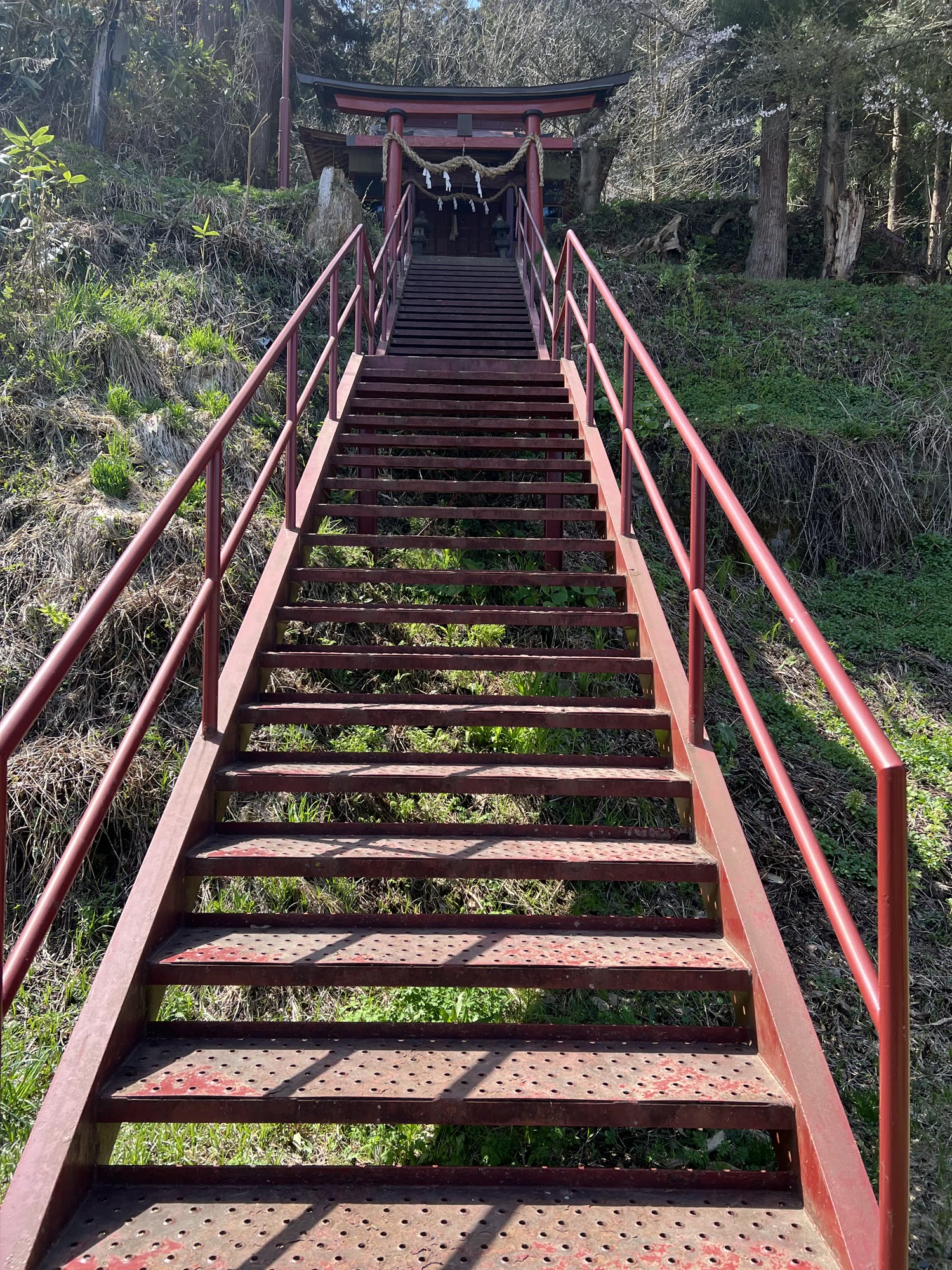 A traditional Inari shrine located in Takko Machi, recognizable by its tall red torii gate and steep stone steps leading up through the trees. 田子町にある稲荷神社です。高い朱色の鳥居と木々の中を登る急な石段が特徴です。